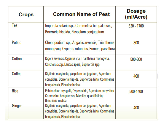 It is used for broad spectrum control of broad leaved weeds and grasses in orchard, plantation crops, tea and non cropped areas.